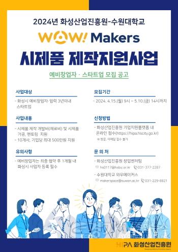 화성산업진흥원(원장 김광재)이‘2024년 WoW! Makers 시제품 제작지원사업’에 참여할 (예비)스타트업을 모집한다.
