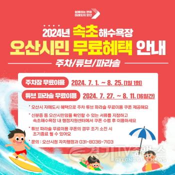 오산시(시장 이권재)는 자매도시인 강원도 속초시에 소재한 속초해수욕장에서 이달 27일부터 8월 11일까지 「2024년 속초해수욕장 오산시민 행복서비스」를 운영한다.