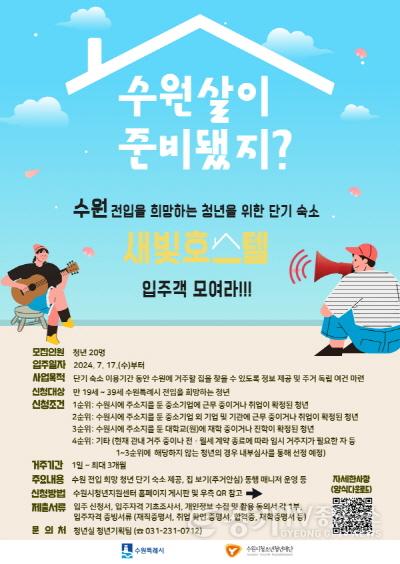 수원유스호스텔 일부 공간은 수원으로 전입해야 하는 청년을 위한 단기 거처 ‘새빛호스텔’로 변신시켰다. 본관동 3층에 위치한 다인용 숙소 10개실을 2인실로 리모델링해 최대 3개월간의 임시 숙소로 지원한다. 벙커침대와 냉장고, 소형 테이블, TV 등 개별 집기를 갖추고, 공용으로 세탁기와 건조기까지 설치해 단기 숙소로 부족함이 없도록 만들었다. 취업이나 취학 등 수원으로 전입해야 할 청년들이 전월세계약 시기 등을 조정해야 할 경우 활용할 수 있는 대안을 제공해 안정적인 정착을 돕는다.