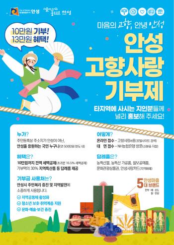 모아진 고향사랑기부금은 사회적 취약계층 지원, 청소년 육성 및 보호, 지역주민의 문화·예술·보건 증진, 지역공동체 활성화 등 안성시 지역발전에 사용될 계획이다.