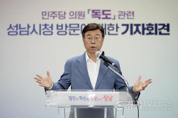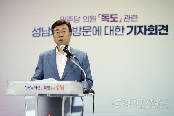 신 시장은 이날 오후 시청 모란관에서 기자회견을 열고 “민주당 중앙당에서 독도 지우기 프레임으로 성남시를 거론하는 것은 지방 사무에 대한 중앙 정치권의 과도한 간섭이며, 92만 성남 애국시민에 대한 모독”이라며 “독도는 지운다고 지워지지 않는 우리 고유 영토”라고 말했다.