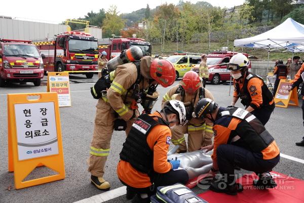 이날 훈련은 성남시 숙박시설에서 발생한 화재로 인해 건물 내 20여 명이 고립되어 다수 사상자가 발생한 상황을 가상해 훈련 메시지가 부여됐고, 소방공무원 90명, 장비 13대가 동원되어 실전처럼 진행되었다.