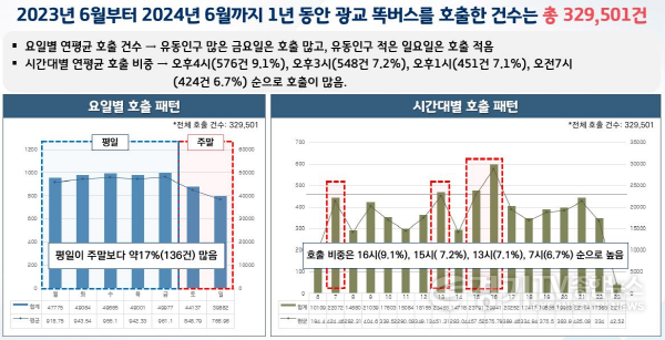 분석 결과, 작년 6월부터 올해 6월까지 1년간 호출 건수는 약 33만 건이며, 연평균 평일 944건으로 주말 808건 대비 17% 많이 호출되는 것이 확인됐다. 시간대별 호출 비중은 오후 4시가 576건(9.1%)으로 가장 높았으며, 오후 3시 458건(7.2%), 오후 1시 451건(7.1%), 오전 7시 424건(6.7%) 순으로 나타났다.