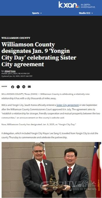 미국 현지시각 1월 9일 미국의 현지 방송 ‘FOX7 Austin’과 ‘Kxan’은 용인과 윌리엄슨 카운티의 자매결연 체결에 대한 기대감과 윌리엄슨 카운티가 협약이 이뤄진 1월 9일을 ‘용인의 날’로 제정한 사실을 보도했다.