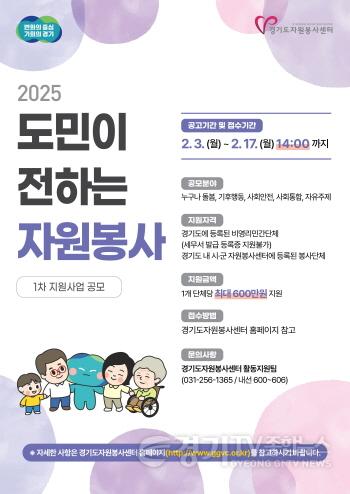 경기도와 경기도자원봉사센터는 오는 3일부터 17일까지 자원봉사 참여문화 확산을 위한 ‘도민이 전하는 자원봉사 1차 지원사업’ 참여단체를 모집한다.